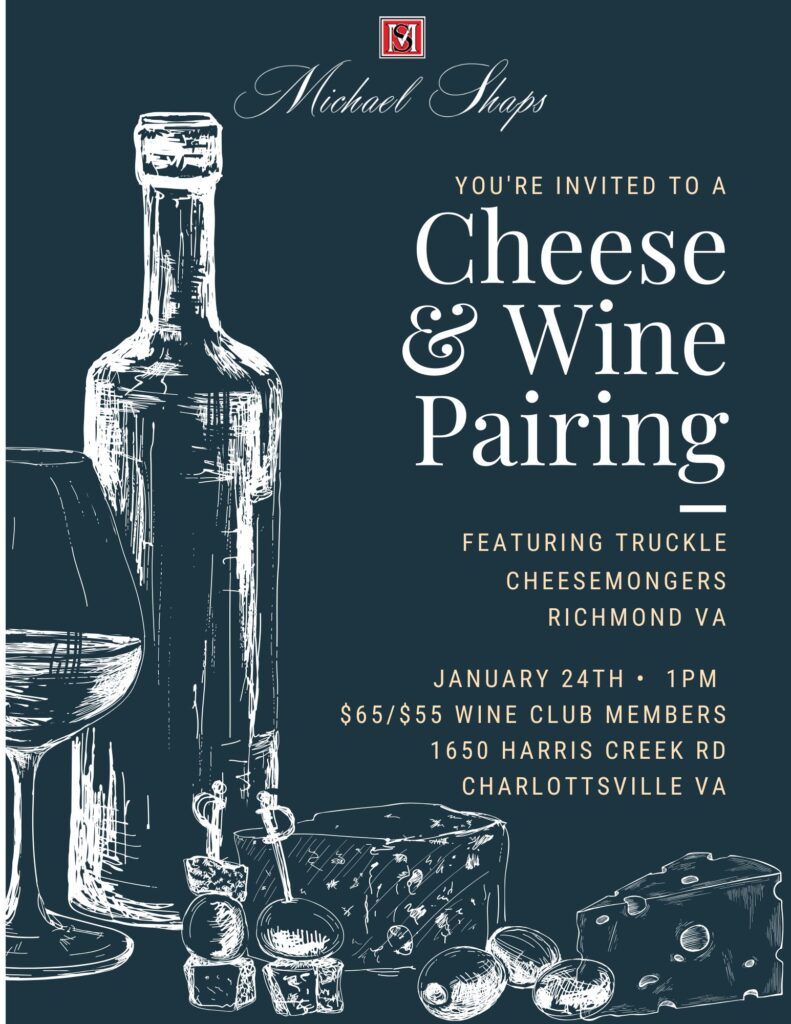 Michael Shaps Wineworks, 1650 Harris Creek Rd. Charlottesville Hosted by Truckle Cheesemongers Featuring curated wine pairings Reservations recommended — limited seating.