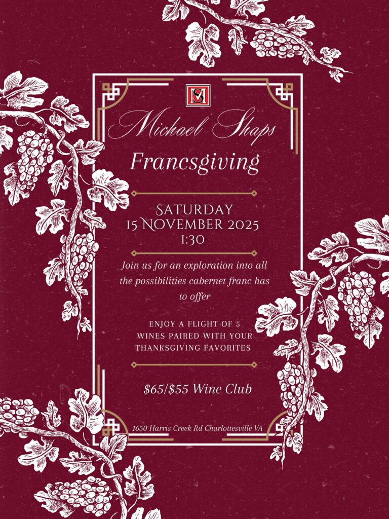 Celebrate the grape that defines Virginia. Join us for Francsgiving, a guided tasting experience featuring five unique expressions of Cabernet Franc from Michael Shaps Wineworks. From crisp and elegant to bold and structured, this flight showcases the incredible versatility of one grape — just in time for your Thanksgiving table planning.